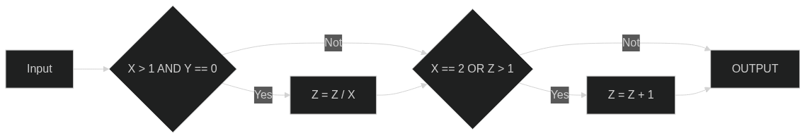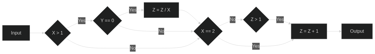 Dado que para um caso que seja verdadeiro em todos os IFs teríamos cobertura de todos os estados possíveis para a variável Z, única com alteração. Um único caso de teste seria suficiente para cobertura de todas as alterações de estado. Contudo esse tipo de cobertura é bem fraco e dificilmente usado como parâmetro para definir uma suíte de teste, caindo no desuso na maioria das vezes.