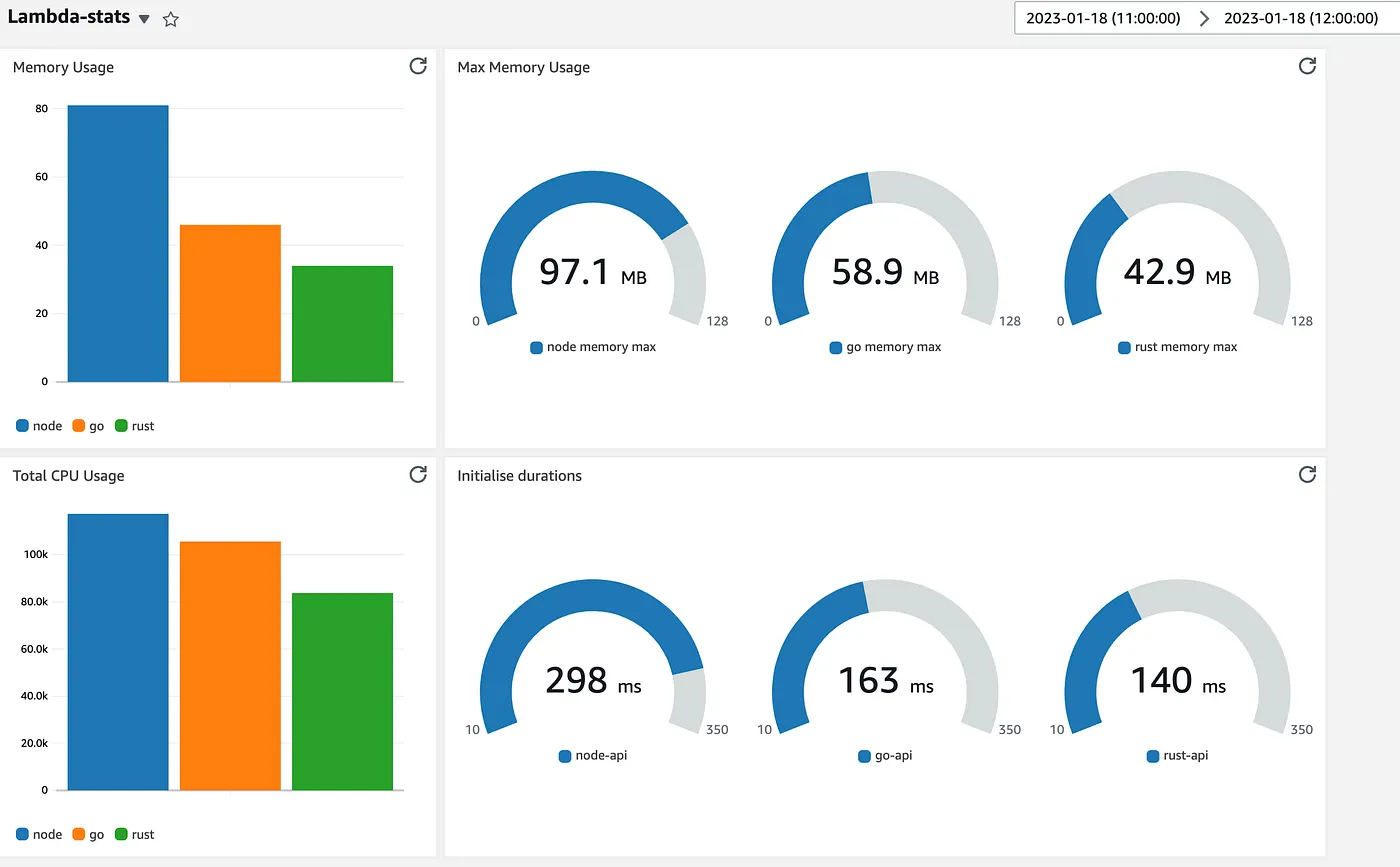 E como esse gráfico abaixo mostra, quando comparado com Go, Node.js e Rust dentro do AWS Lambda, o Rust conseguiu ser mais rápido e usar menos recursos que as outras tecnologias: