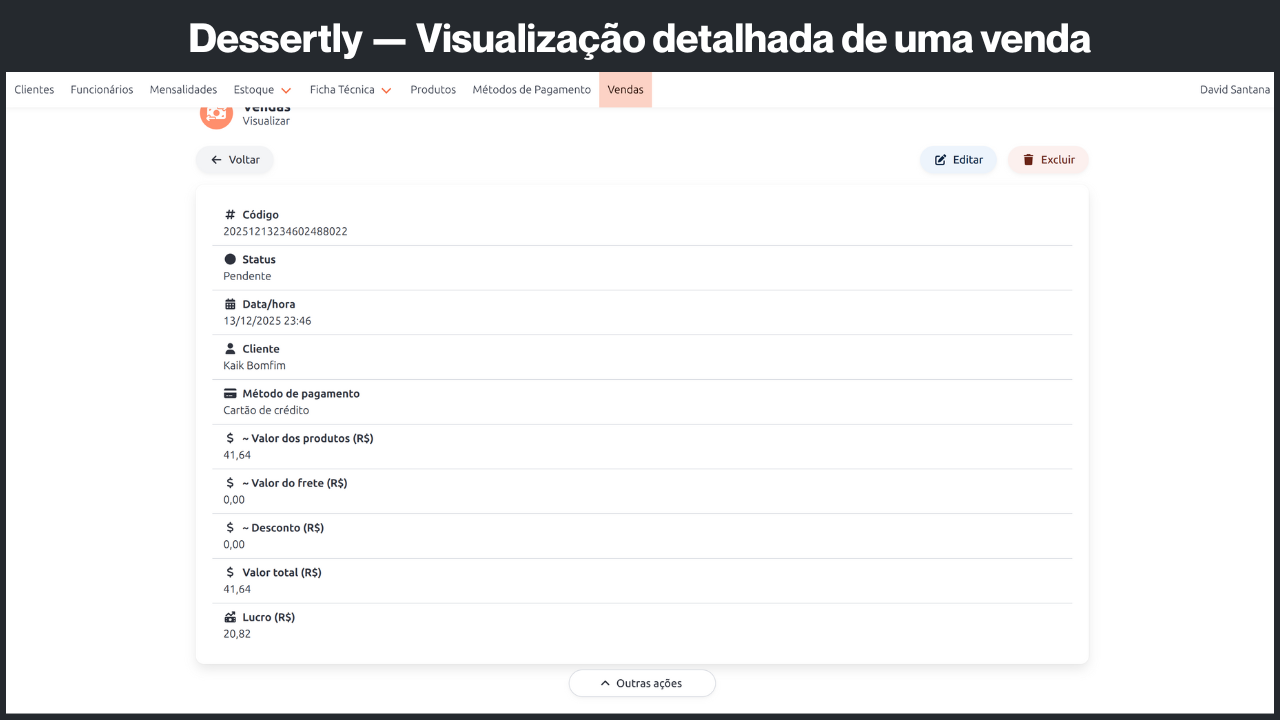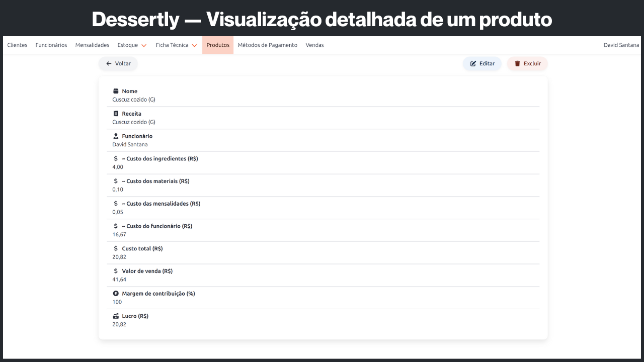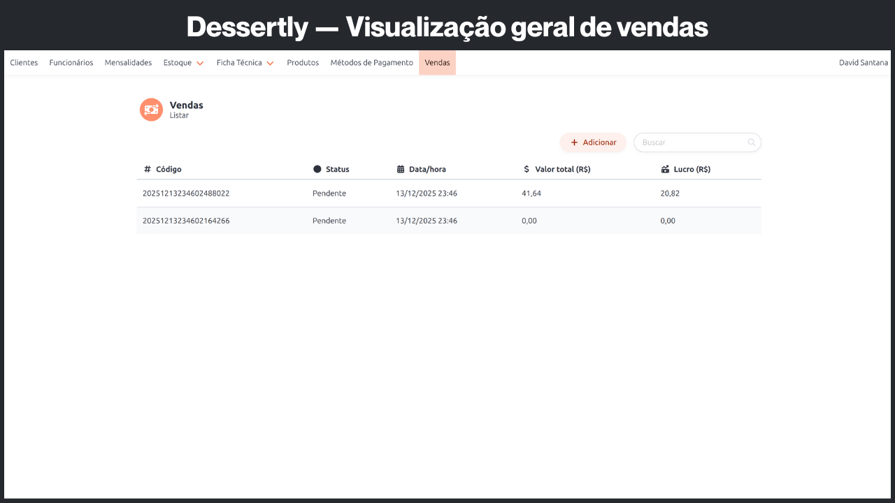 O Dessertly já foi validado e utilizado no dia a dia de uma loja real. O código está relativamente maduro, resolvendo o problema a que se propõe. É claro, não está no estado da arte, meu foco foi em trazer um mínimo produto viável (MVP).
