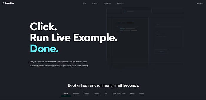Um ambiente de desenvolvimento online para uma estrutura rápida de projetos Angular, React, Vue, Vanilla, RxJS e TypeScript.