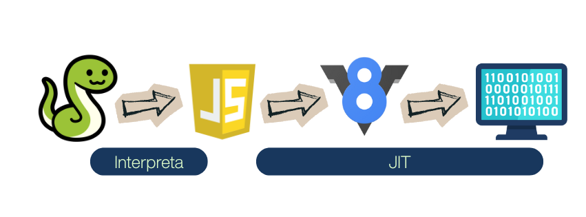 No caso do Pituguês, ela é uma linguagem de programação desenvolvida em TypeScript que passará direto para o JavaScript, que é uma linguagem de característica híbrida, o que chamamos de Just In Time Compilation (JIT), para traduzir/transpilar o Pituguês para a linguagem de máquina e ser executado. O processo de transpilação do JavaScript se dá por uma Máquina Virtual, chamada de V8, para criar o código de máquina e rodar o programa.