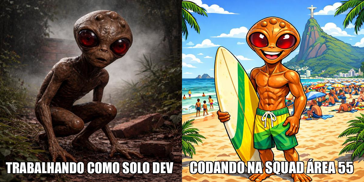 Se você curte a vida de indie hacker e prefere estar dev solo, blz. Mas se não curte muito, e começou a ficar desanimado por trabalhar sozinho, sem ninguém pra interagir, sem ânimo pra explicar tudo de novo pro seu ruber-duck, então fazer parte de uma squad pode ajudar. Até escrevi um post sobre isso: Uma Boa e Má Notícia para Quem Tem Medo de Perder Emprego pra IA.